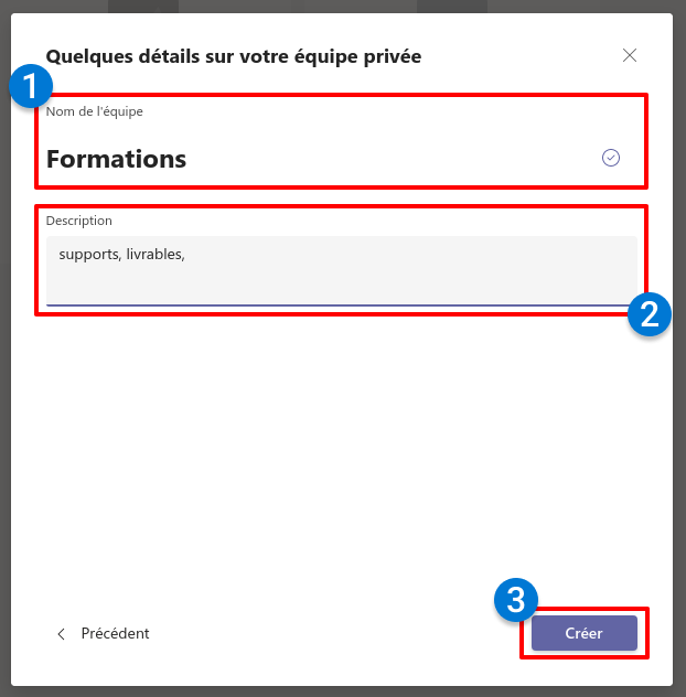 Définissez le nom de votre équipe, ajoutez une description (facultative) puis cliquez sur « Créer ».